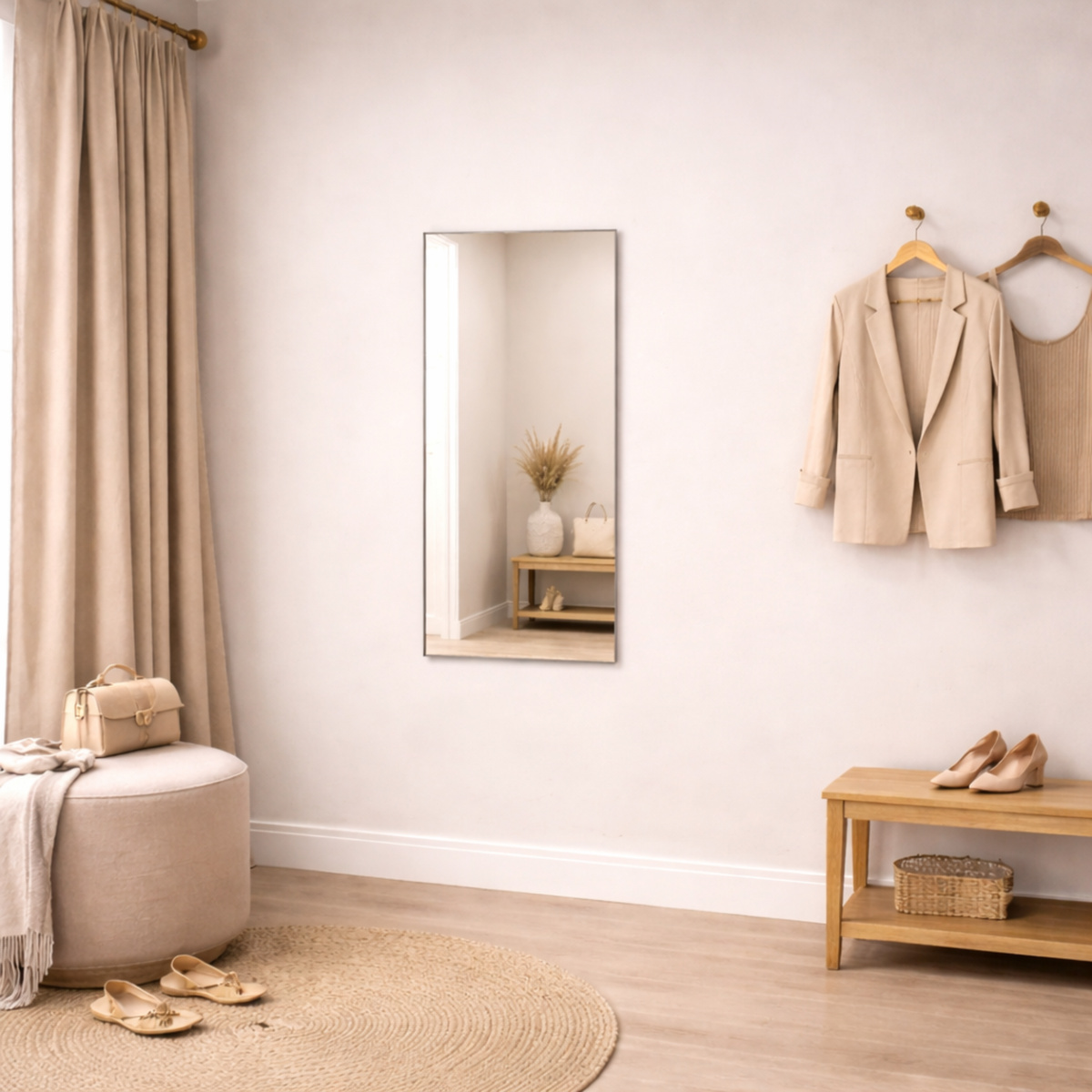 Spiegel auf dem Boden ist, dass Sie den Spiegel überall aufstellen können. Sie können ihn nicht nur verwenden, um eine leere Wand aufzulockern, sondern auch, um eine leere Ecke zu füllen, indem Sie ihn schräg stellen.